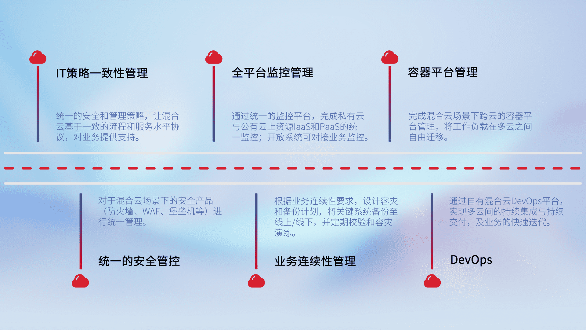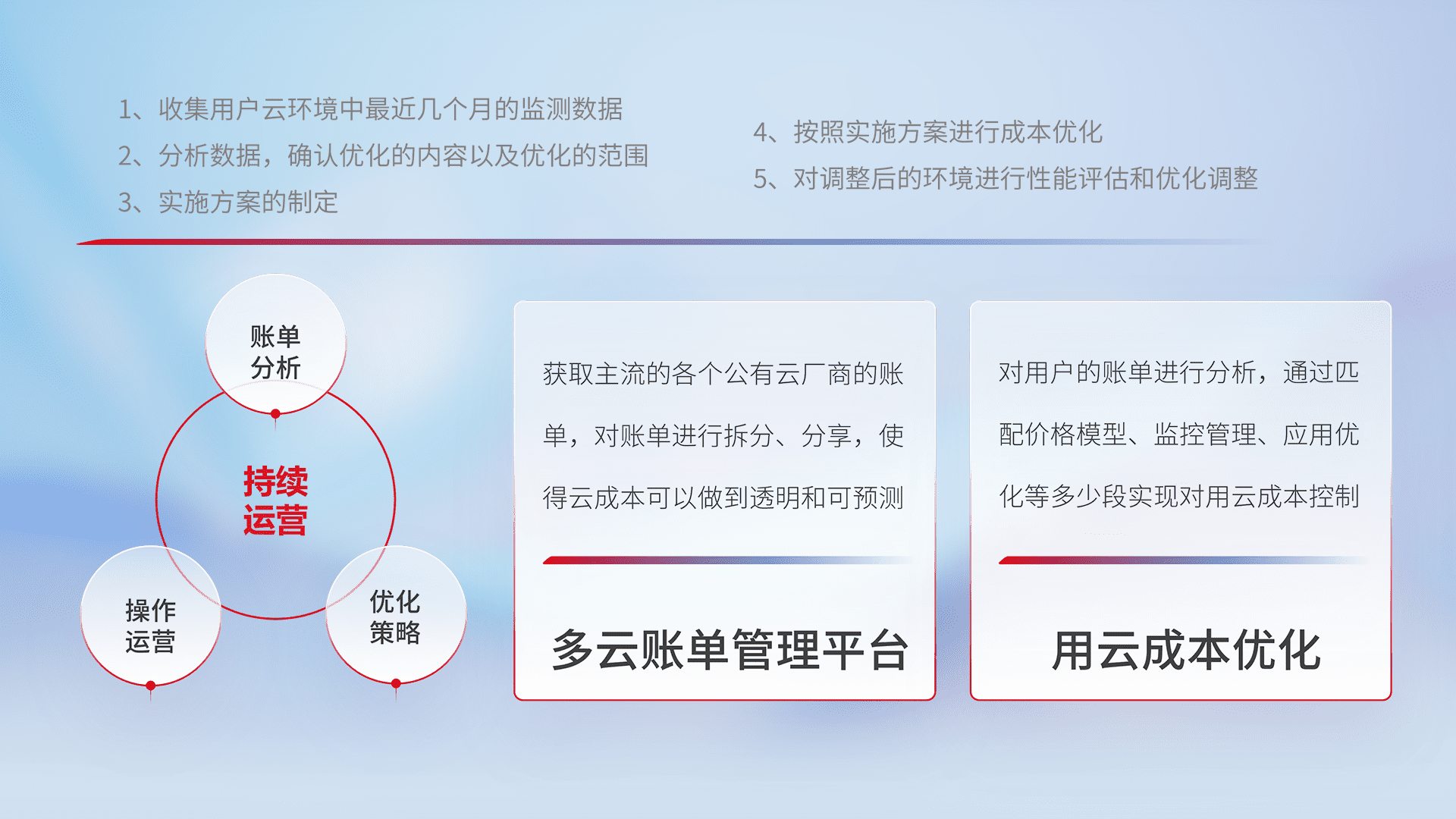 通过多云纳管,,,以统一的资源数据模型把客户的云资源进行抽象和封装,,,进而实现对多云资源的统一操作,,,,保障云资源管理的可靠性、、、稳定性与可用性。。量身定制化运维内容,,,配置、、、、开发运维、、、补丁管理、、备份、、监控、、、、认证和访问管理、、、审计和日常巡检等,,保障在用云过程中的可靠度,,,,稳定度以及高可用率。。。。