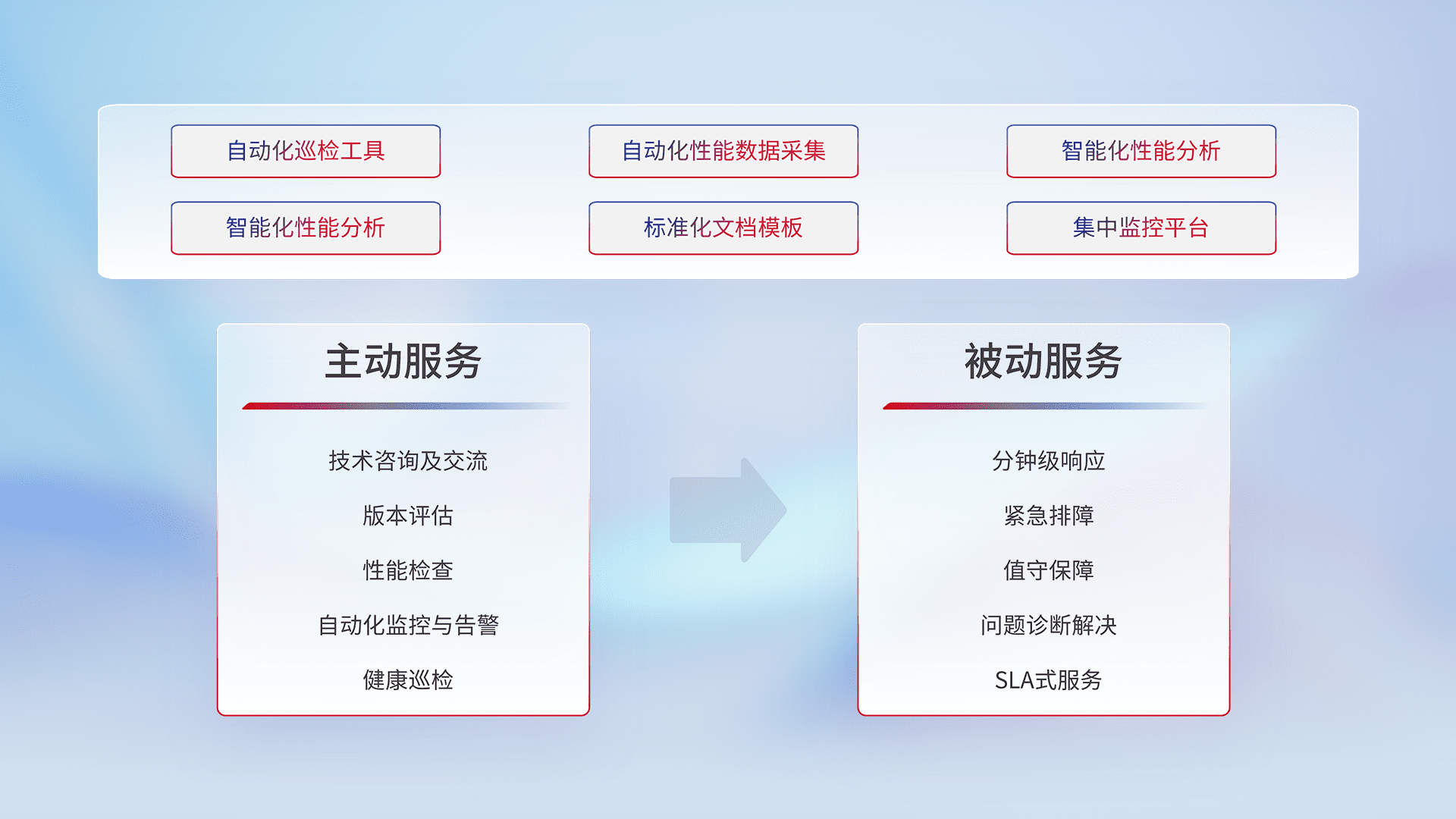 智能化工具和标准化文档,,保障服务质量,,提供主动服务(包含技术咨询、、、、版本评估、、、性能检查、、、自动化监控与告警、、、、健康巡检)和被动服务包含(分钟级响应、、、、紧急排障、、值守保障、、、、问题诊断解决、、、SLA服务)。。。。